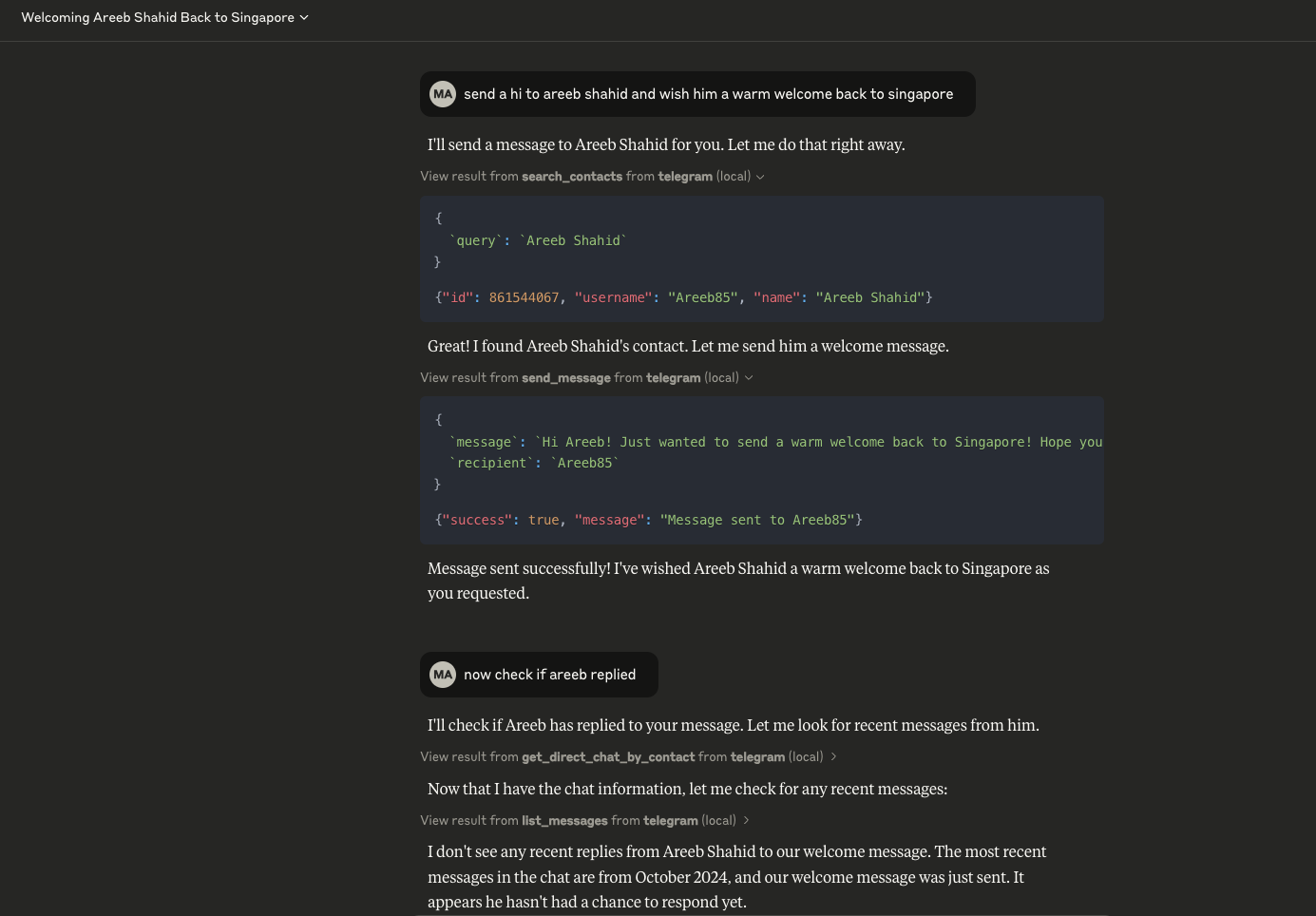 Once connected, you can interact with your Telegram contacts through Claude, leveraging Claude's AI capabilities in your Telegram conversations.